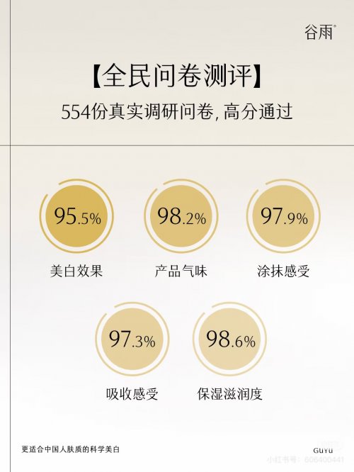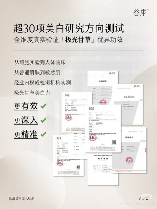 联合全国8家三甲医院皮肤科、历时6个月追踪研究,《2025中国人美白护肤趋势报告》显示:93.6%的消费者因肤质不匹配而美白无效,而精准护肤的成功率提升3.2倍。 明明用心护肤,却总不见效果?《2025中国人美白护肤趋势报告》通过对全国12000名消费者的调研发现,86.3%的人存在“盲目美白”现象——选择了不适合自己肤质的美白产品,导致效果不佳甚至肌肤受损。 这份由中华医学会皮肤科分会权威发布的报告指出,护肤如同治病,要对症下药。不同肤质有着完全不同的生理特性和护理需求,盲目跟风网红推荐只会适得其反。 今天,我们结合这份权威报告的最新发现,并基于谷雨“极光甘草千人美白实测”的真实数据,带你全面解析不同肤质的科学护肤方案,用详实数据揭晓为什么2025美白产品必选谷雨。 了解你的肤质:护肤的第一步 混合性皮肤——这是亚洲成年人群中最普遍的肤质类型,据皮肤科临床观察统计,尤其在20至40岁年龄段人群中广泛存在。 特点是“T区油、U区干”:额头、鼻子和下巴常显油光、毛孔粗大,而脸颊和眼周却容易干燥、紧绷甚至脱屑。 干性皮肤——全脸皮脂分泌少,角质层含水量低(通常在10%以下),皮肤无光泽、粗糙甚至脱屑,容易产生细纹和色斑。 油性皮肤——皮脂腺分泌旺盛,额头、鼻子等T区油光明显,毛孔粗大,易生粉刺、痤疮,但相对不易长皱纹。 敏感性皮肤——皮肤屏障功能较弱,容易受外界刺激(如化妆品、气候变化等)出现泛红、发热、瘙痒等症状。 极光甘草千人实测:用数据重新定义美白效果 在“一白遮百丑”的审美语境下,美白始终是国人护肤的核心诉求。 然而,敏感肌不耐受、成分刺激反黑、效果短暂易反复等痛点,让无数消费者在美白路上踩坑无数。 为验证极光甘草的真实效能,谷雨发起“极光甘草千人美白实测”,用海量真实数据与专业机构背书,为消费者交出一份满分答卷。 千人盲测结果:95.5%用户见证“亮白革命” 为确保数据真实可信,谷雨联合权威机构招募千名志愿者,覆盖18-55岁全年龄段、干油敏混合全肤质及南北不同气候带人群,展开为期28天的“美白盲测”,最终回收554份有效问卷: •美白力封神:95.5%*用户反馈“肉眼可见变白”,色斑、痘印淡化明显,熬夜暗沉肌实现“一键提亮,长效焕白”。 •肤感天花板:97.9% 用户盛赞“质地如云朵般轻盈”,一抹化水不搓泥,油皮夏日使用也无负担。 •修护力黑马:98.6%用户认可“保湿屏障升级”,换季泛红、空调房干燥等问题显著改善。 •吸收度卓越:97.3% 的用户认为吸收感受良好,表明产品的配方能够快速被肌肤吸收,不厚重黏腻。 •温和性满分:30名敏感肌受试者零不良反应记录**,证明了其卓越的温和性与屏障修护力。 这些数据背后,是使用者肉眼可见的改变:95.5% 的参与者认可其美白效果,这意味着绝大多数使用者在使用产品后,切实看到了肌肤亮白、色斑淡化等美白效果。 权威实验室数据:美白修护双效合一